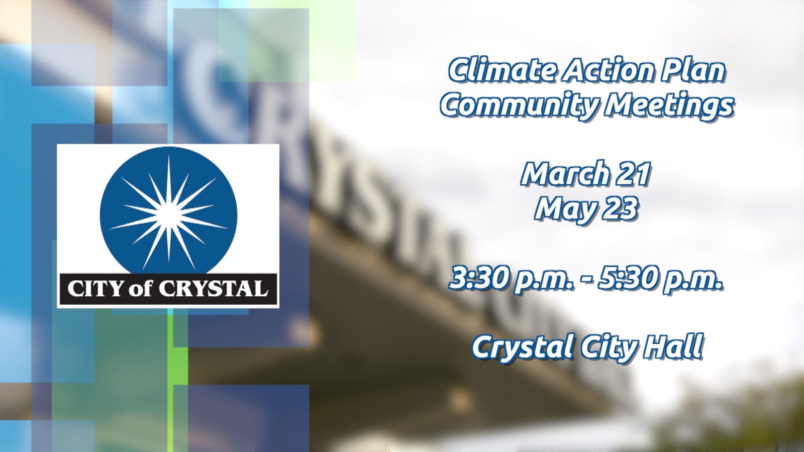 The meetings are at the Crystal City Hall Upper Community Room, 4141 Douglas Dr. N. Attend a meeting, share your ideas, and help shape Crystal’s climate-resilient future: