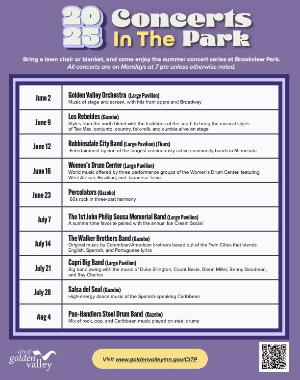 Golden Valley’s lineup for this summer’s Concerts in the Park features a wide variety of musical acts and genres for the whole family to enjoy.