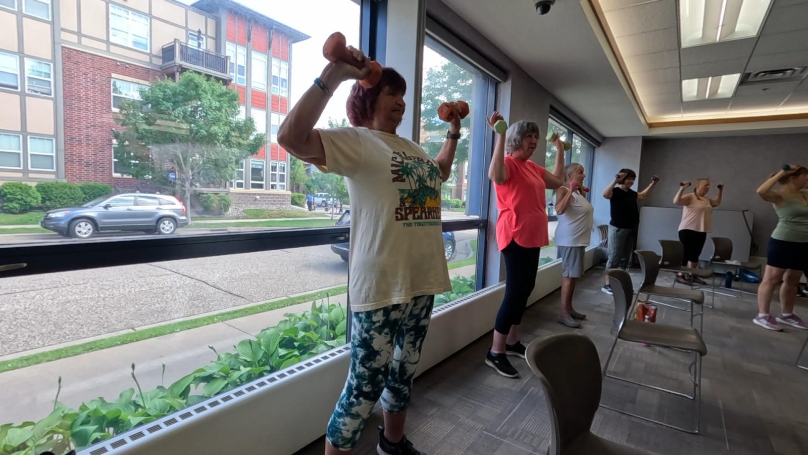 Pam Neuman lifts weights during the strength and balance class at the Osseo Community Center.