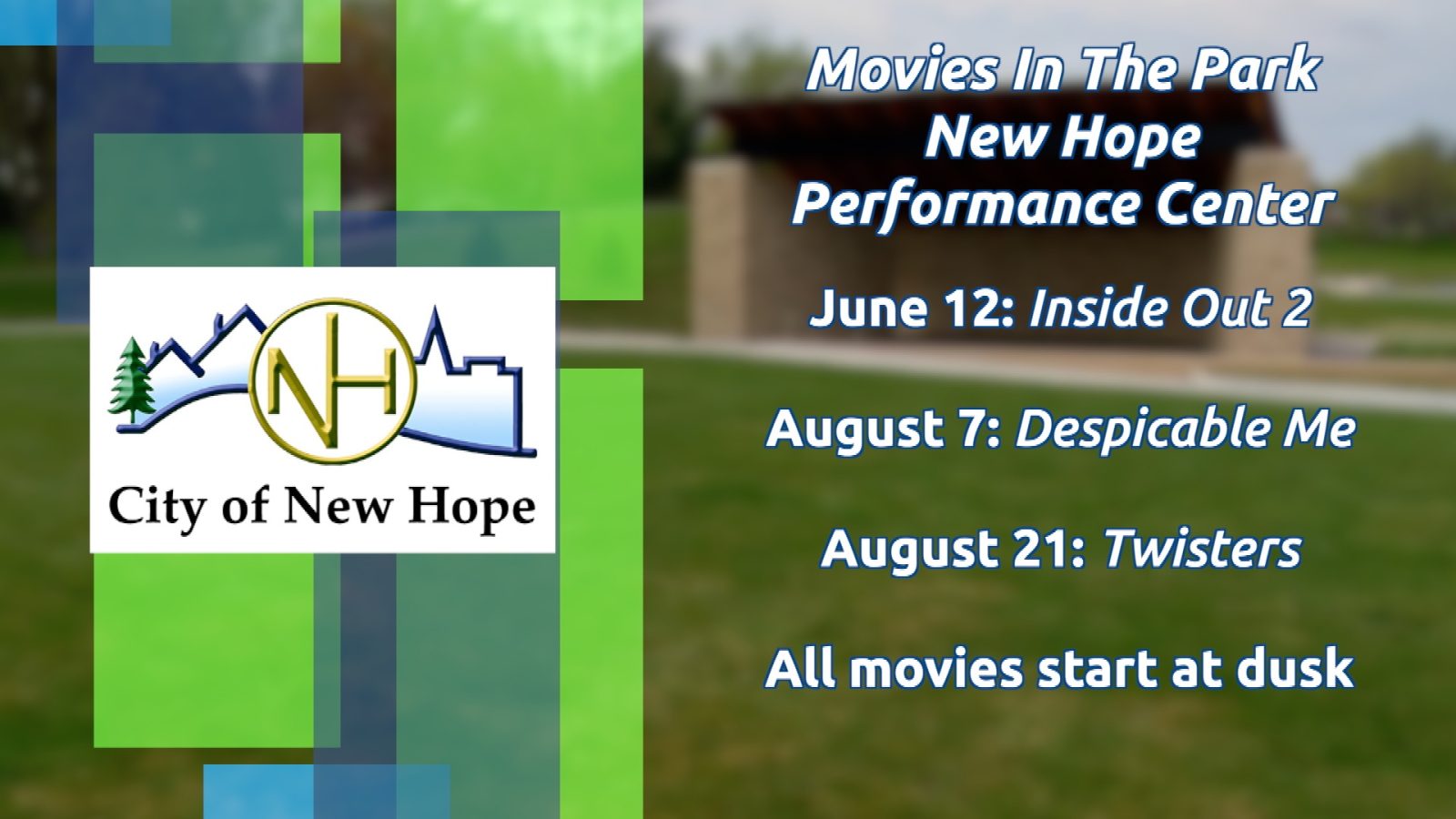Movies will be shown on a jumbo screen at the New Hope Performance Center. Bring your own blanket or chair. Come a little early to get your spot and participate in pre-movie activities! If weather is questionable call the weather cancellation line at 763-531-5158.