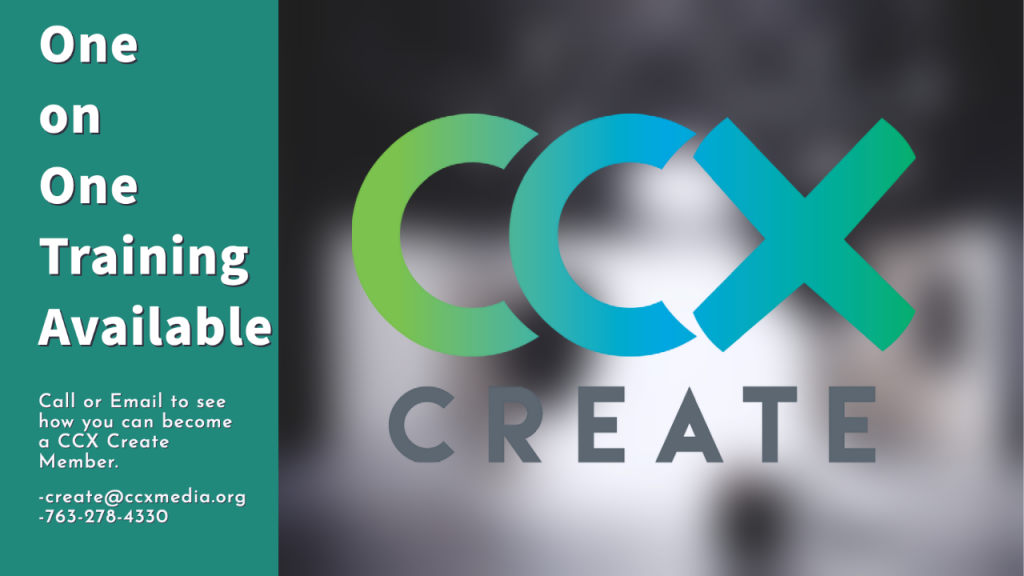 CCX Create will be offering one on one training, instead of group classes. We will provide training at your convenience day or evenings (during studio hours). If you or someone you know would like to take the training, please call 763-278-4330 or email create@ccxmedia.org