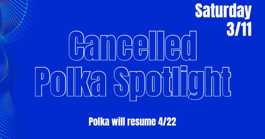 Polka Spotlight is cancelled for March 11, 2023. They will be back with the Cathy Erickson Band April 22, 2023, due to the Easter holiday. Please arrive at 2pm if you are attending the taping.