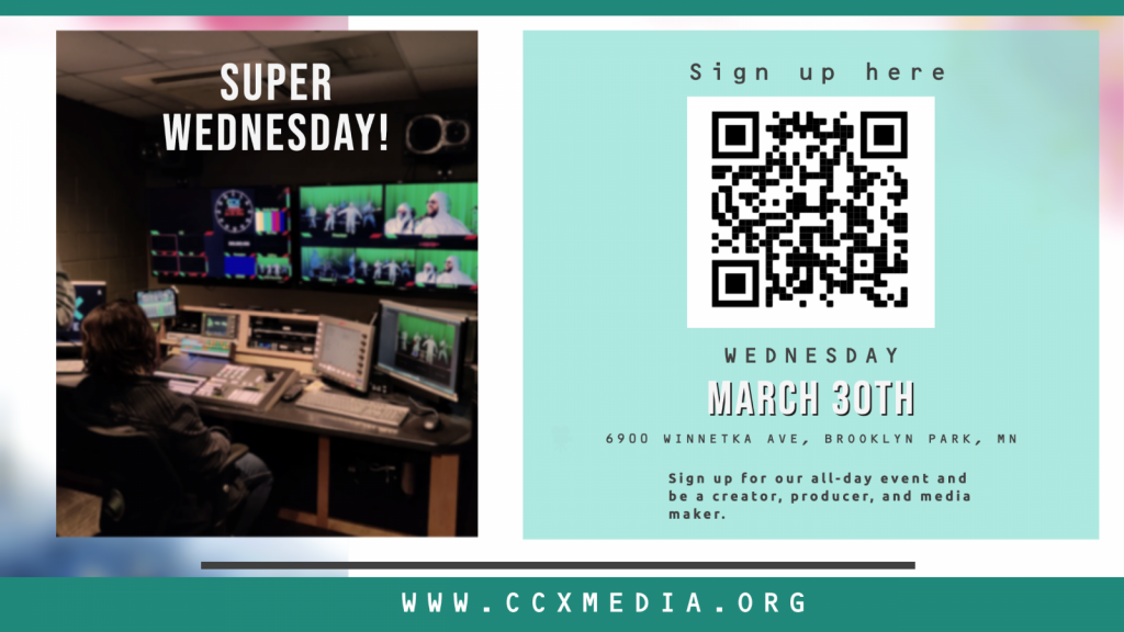 If you or someone you know is interested in becoming a CCX Create member, please sign up for Super Wednesday. This will be an all-day event including orientation, portable camera, studio production, and final cut editing class sessions. Once you are certified, you can use the CCX Create equipment and facilities!