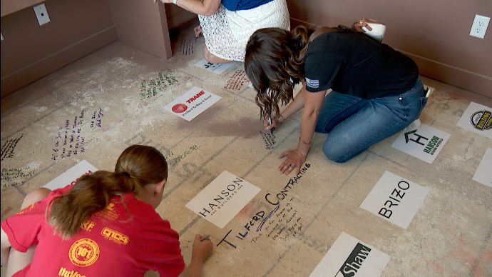 People signing the floor of the St. Jude Dream Home in Maple Grove.