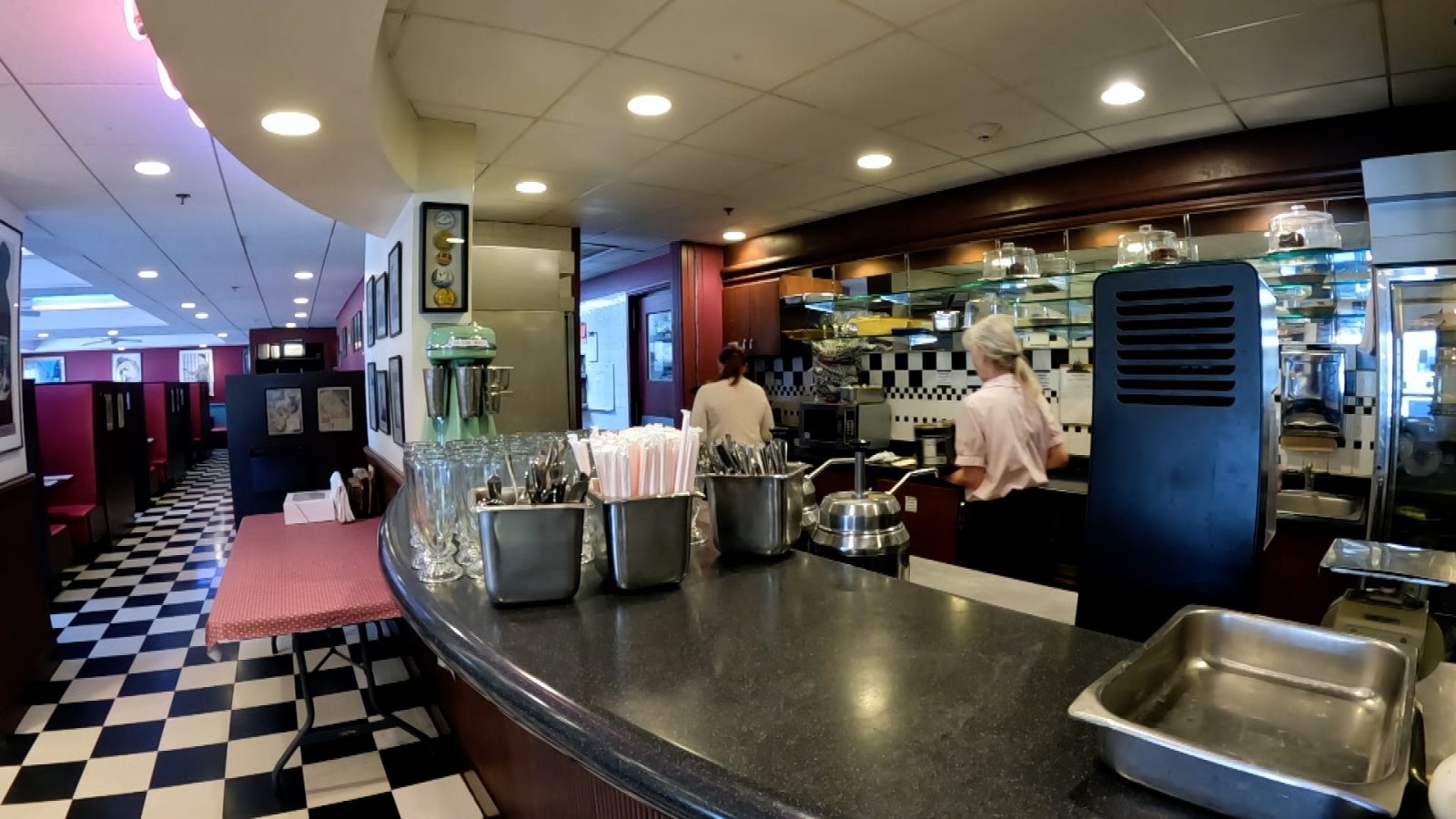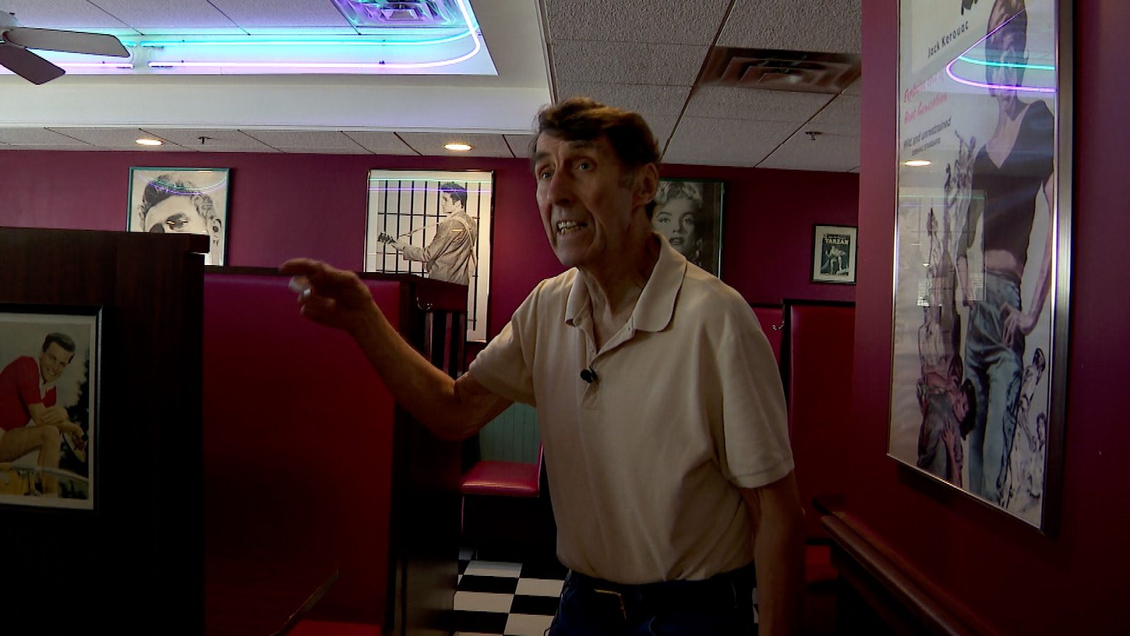 50’s Grill owner Jack Schubert gives a tour of the restaurant. Its decorated with 50’s artwork, photographs and neon lights.