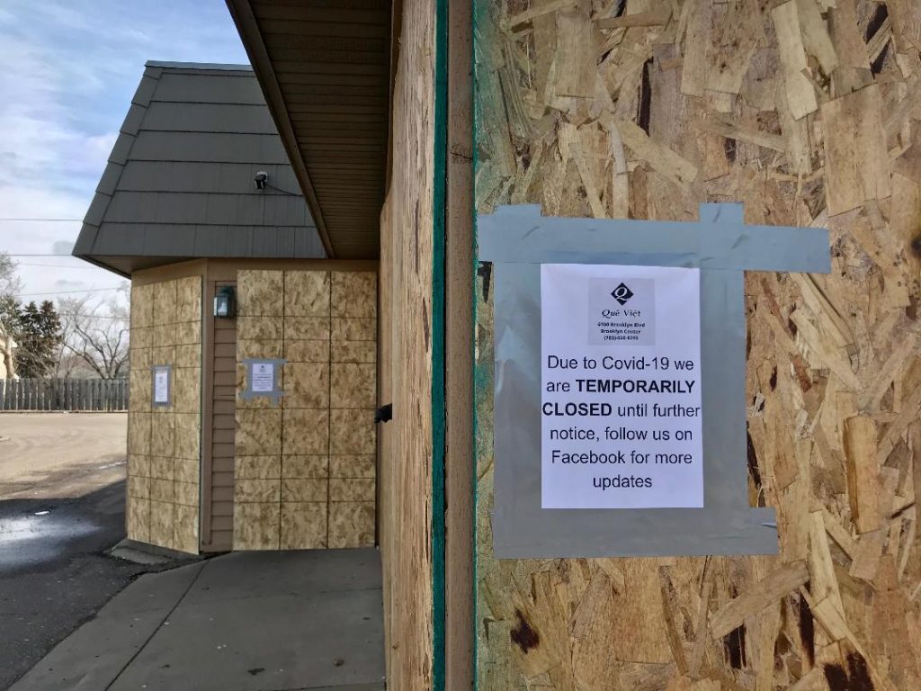 A sign on the side of Que Viet Village House In Brooklyn Center says the business is temporarily closed.