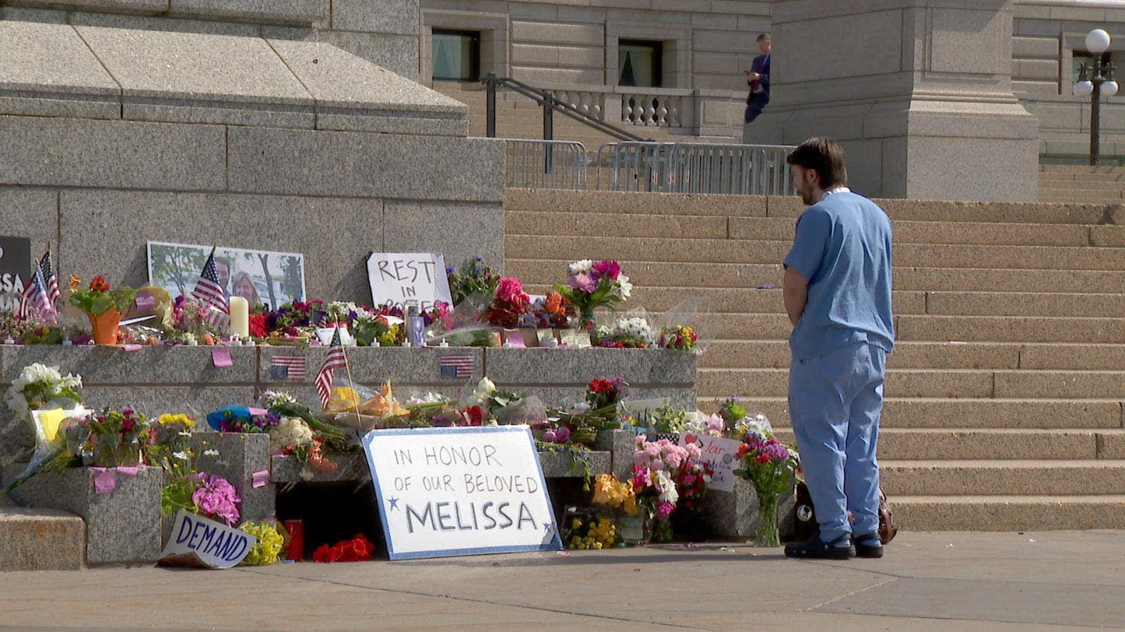 A mourner visits a memorial for Rep. Melissa Hortman and her husband Mark at the state Capitol. The city of Brooklyn Park is considering ways to permanently honor their legacy.