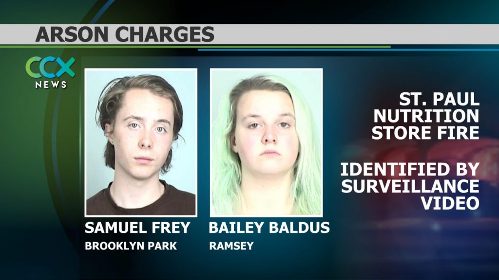 A 19-year-old Brooklyn Park man is among two people charged in the arson of a St. Paul health and nutrition store. Samuel Frey, 19, of Brooklyn Park, and Bailey Baldus, 19, of Ramsey, are each charged with one count of conspiracy to commit arson. U.S. Attorney Erica MacDonald announced the charges Tuesday.