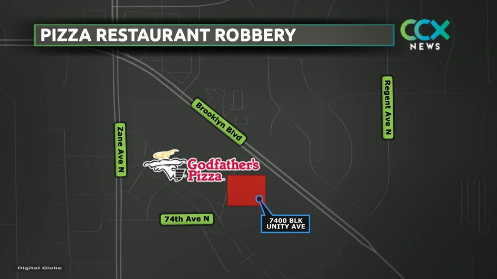 Police say two people entered Godfather’s Pizza on the 7400 block of Unity Avenue North at around 7:15 p.m. Wednesday. The robbers told employees they had a gun, but did not show it, police said.