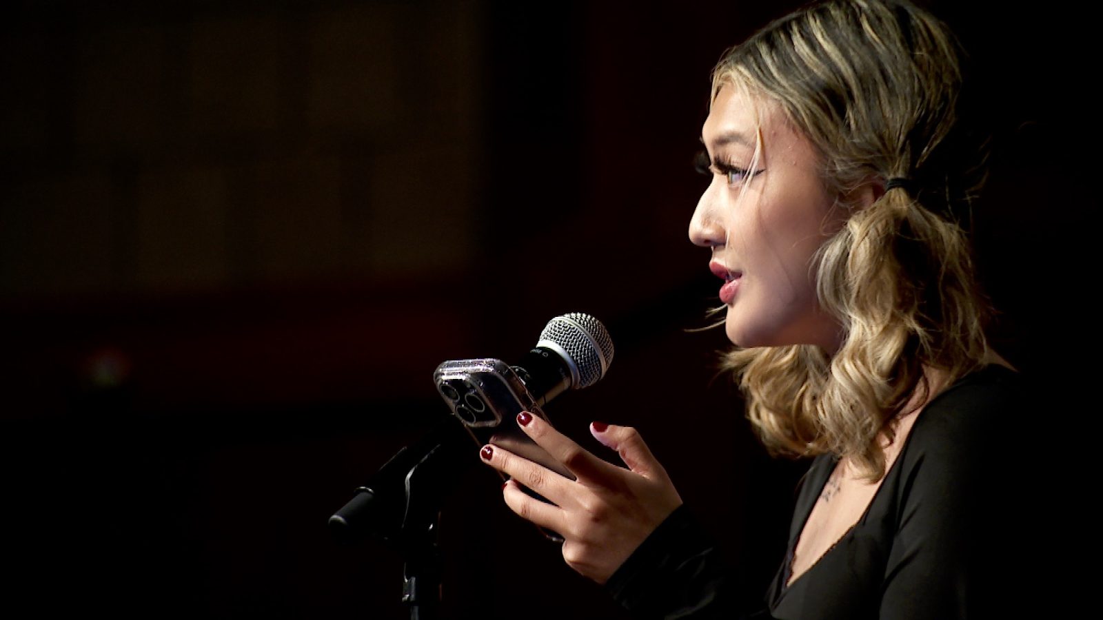The students used Maya Angelou’s poem “Still I Rise” for inspiration. Piece by piece, they put their work together to craft a full score for the poem. On stage, a student reads the poem while the orchestra plays.