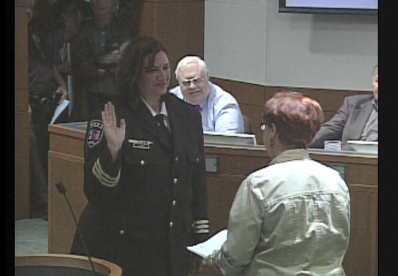 Stephanie Revering (Stephanie Fealy at the time), being sworn in as Crystal Police Chief in 2012.
