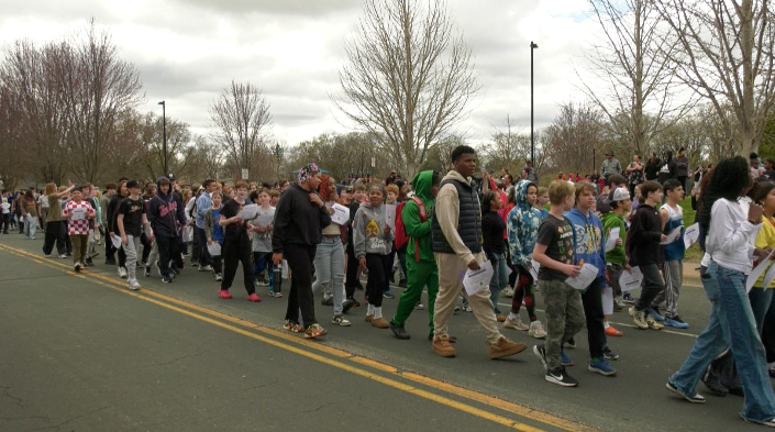 Honor Roll students from the FAIR School Crystal march along Adair Avenue during a parade in their honor.