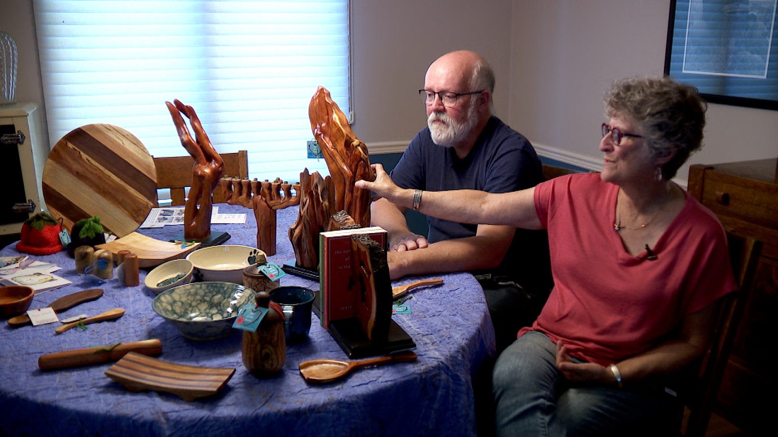 Rhoda and Dave demonstrate some of their work. Not all of it is buckthorn-made. Some of the art is even ceramic. All proceeds from their projects go back into the community.