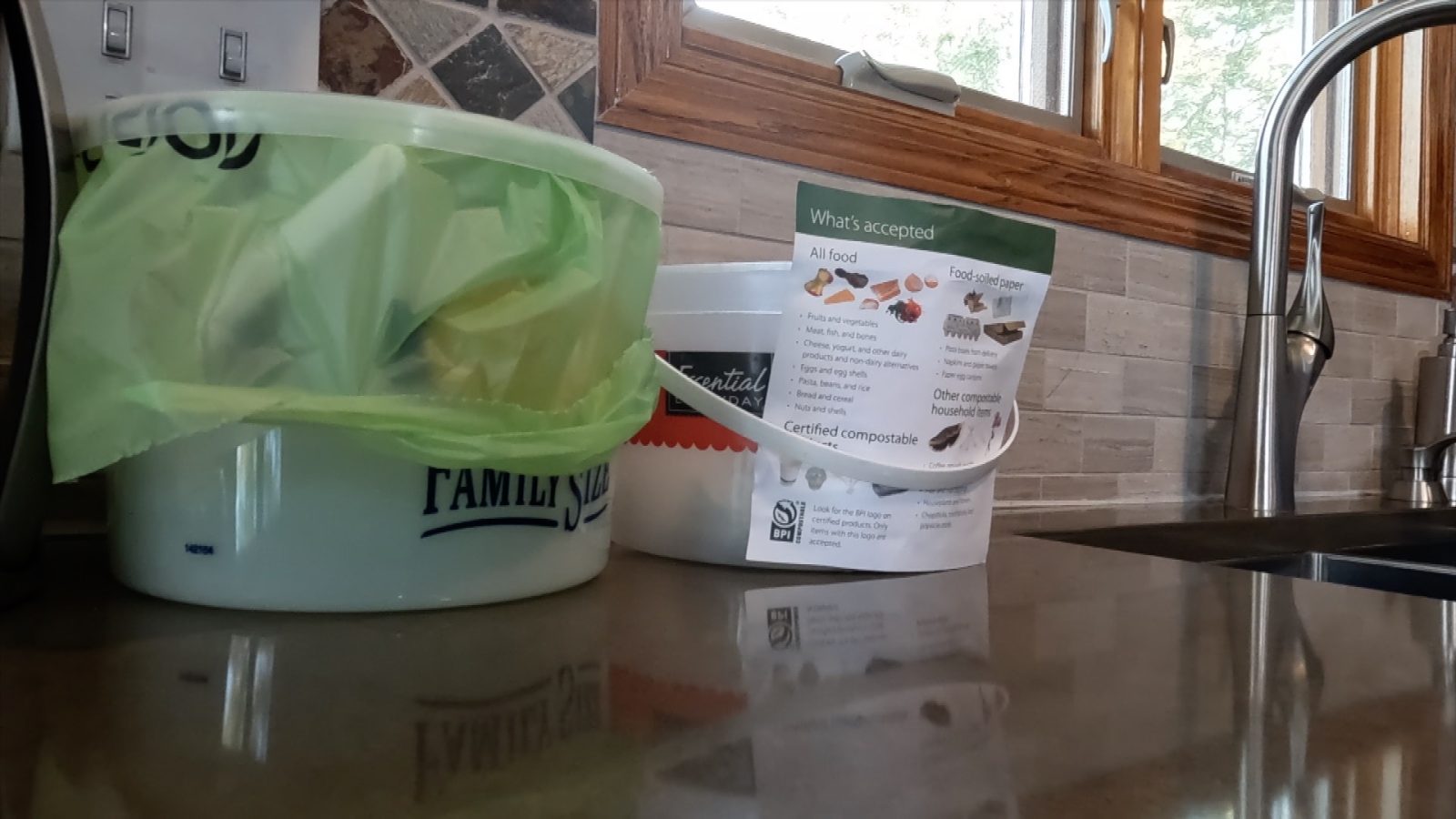 Stand puts organics materials in ice cream tubs by her sink. One has a compostable bag, where she puts food waste. The other bin she uses for paper waste. It all goes into her organics bin come Monday.