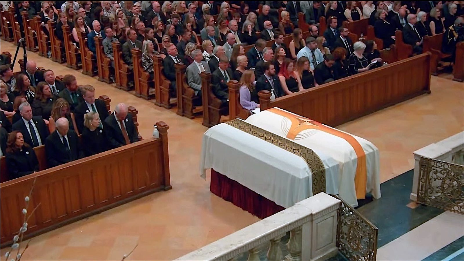 Former President Joe Biden and Vice President Kamala Harris sat front row at the Hortmans’ service. (Courtesy DPS YouTube)