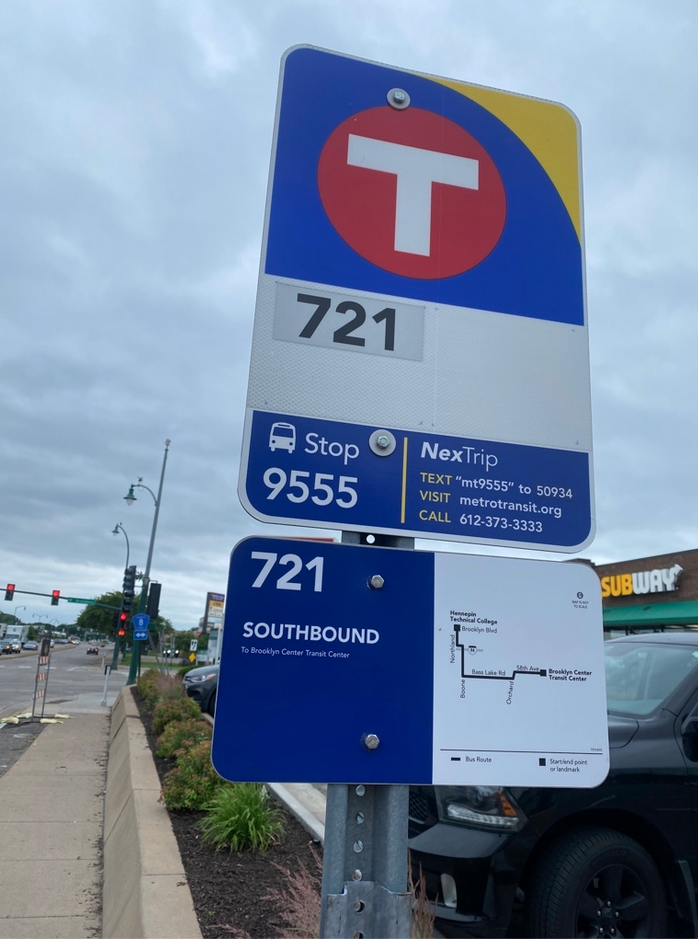Metro Transit is asking people to provide input on bus signs like this, located near the intersection of West Broadway and Bass Lake Road in Crystal.