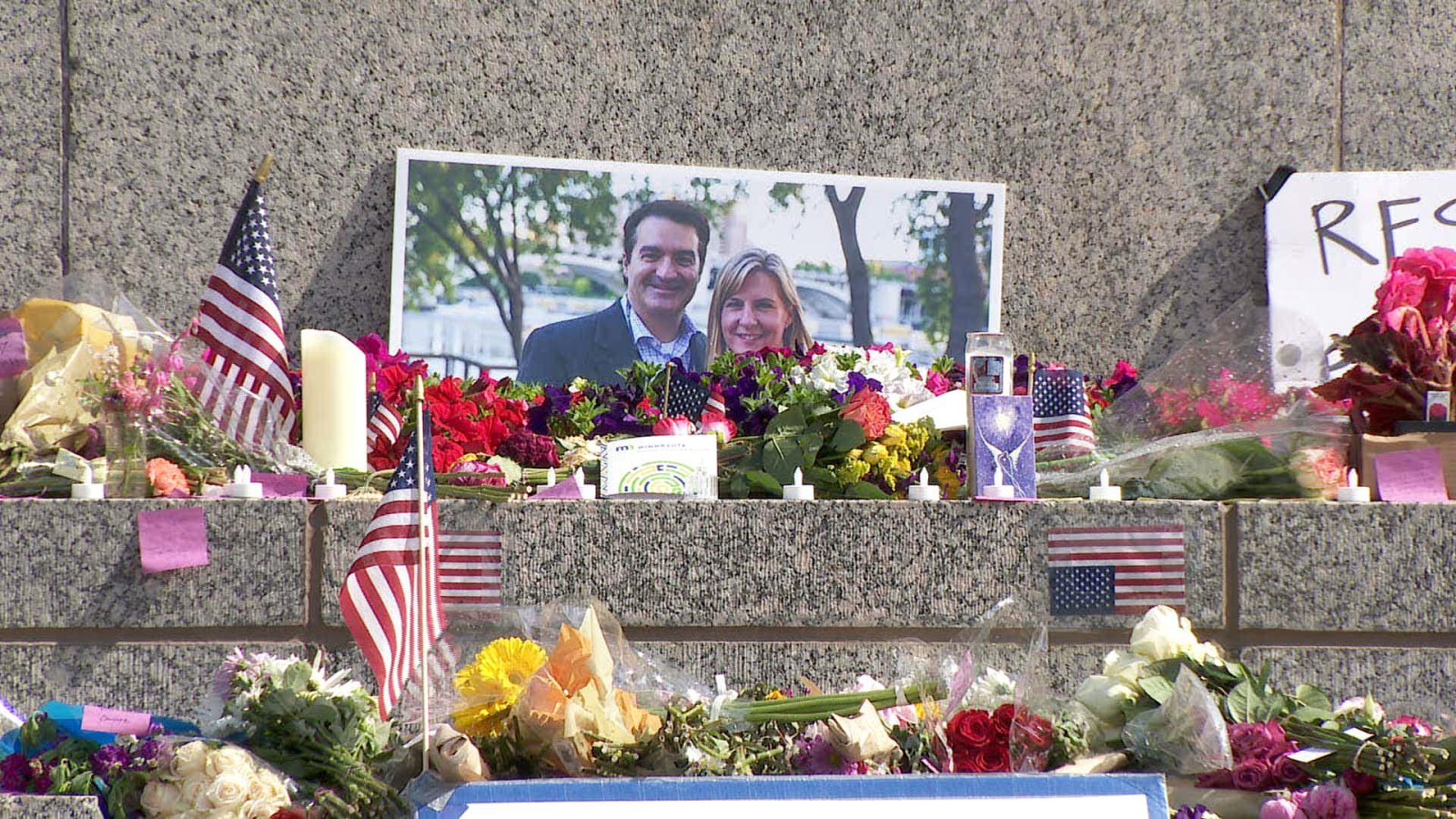 Makeshift memorial displays image of House Speaker Emerita Melissa Hortman and her husband, Mark.