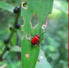 Ambourn says both the larvae and adults eat holes in lilies. The larvae cause the most havoc. Ambourn says they can completely strip plants of their leaves and flowers. Their favorite plants are true lilies, so your day lilies, calla lilies, and canna lilies are safe, she said. The adult pests will also sometimes eat hollyhocks, potato, hostas, and a few other plants.