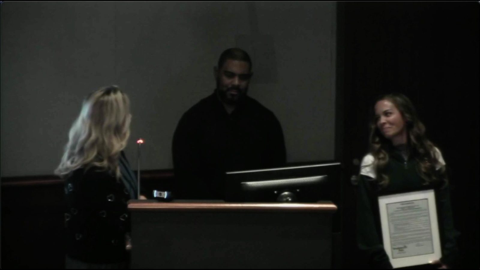 In this screengrab from the Nov. 24 Brooklyn Park City Council meeting, Council Member Shelle Page and Mayor Hollies Winston thank Emily Juaire for her work.