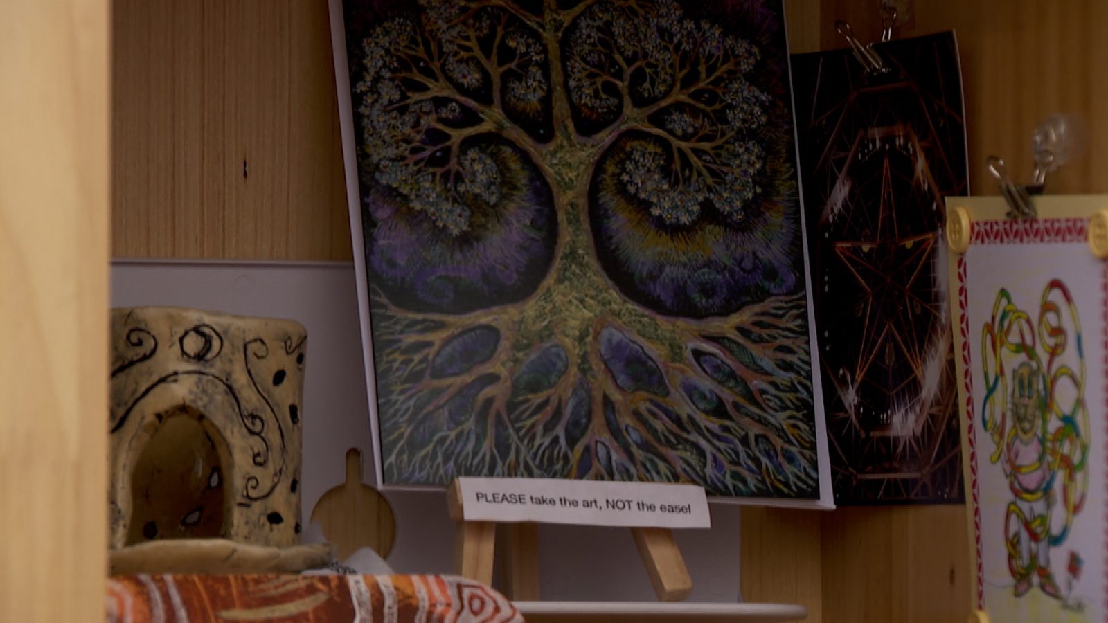The little gallery is a home to art and supplies of all kinds from anyone who drops them off. Supplies include paper, chalk, pencils and all kinds of materials.