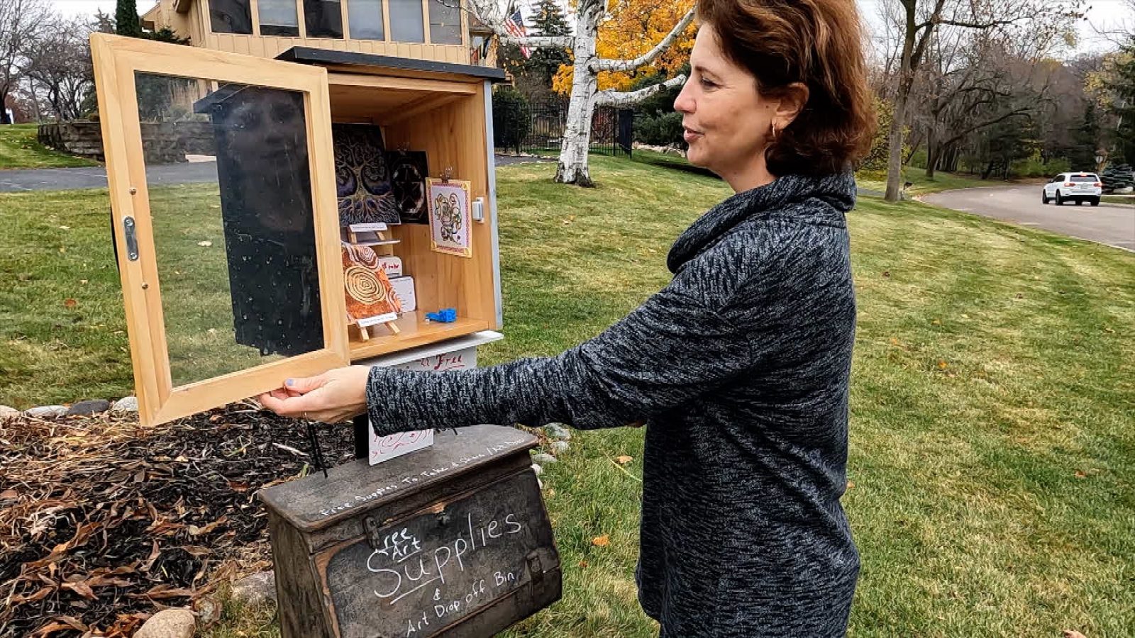 Pogonat opens the door to her Free Little Art Gallery. It was crafted with a box typically used for “Little Free Libraries.”