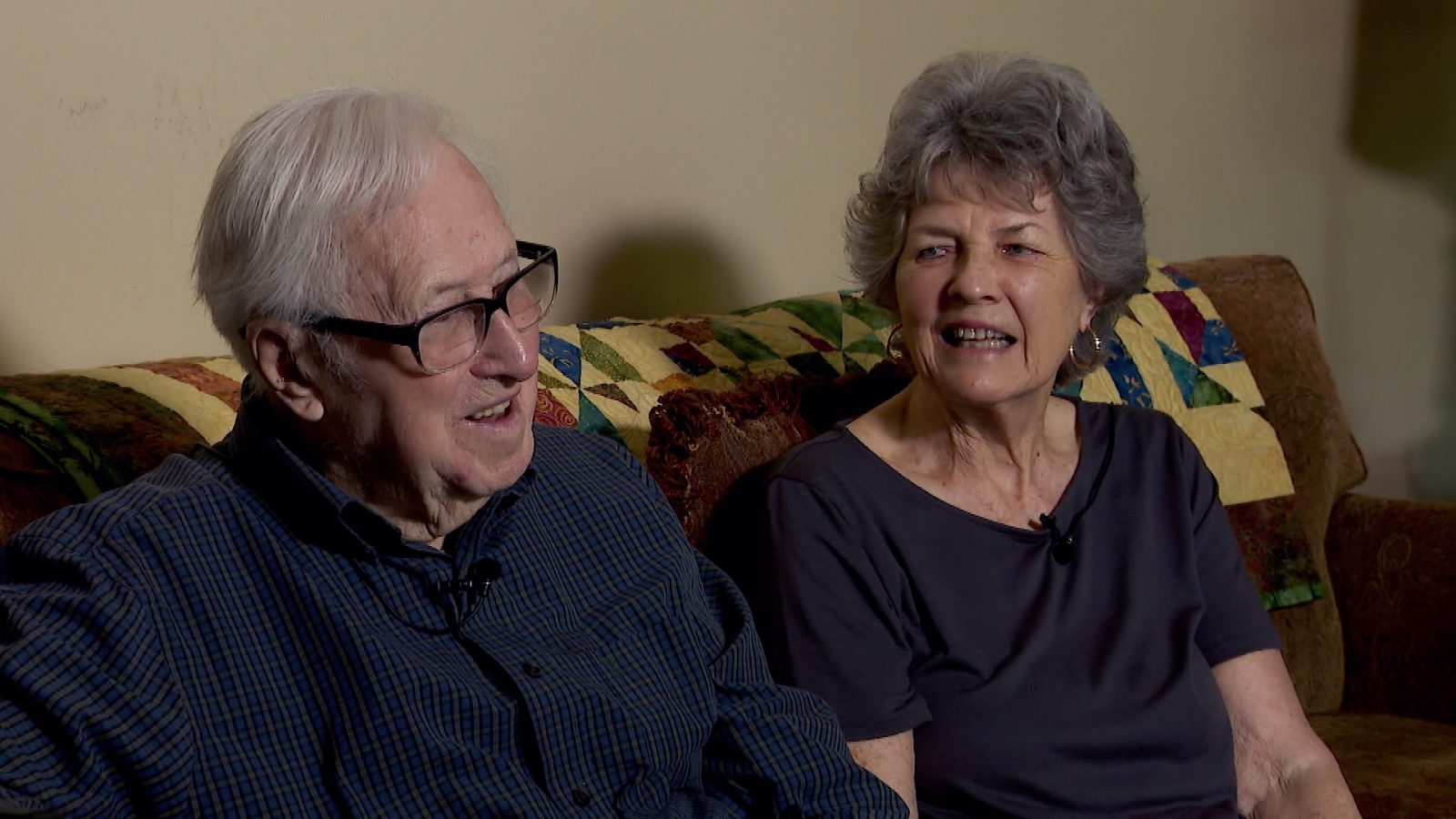 Rick and his wife, Janet, sit on the couch together in their Plymouth home. They’ve lived there for 55 years.