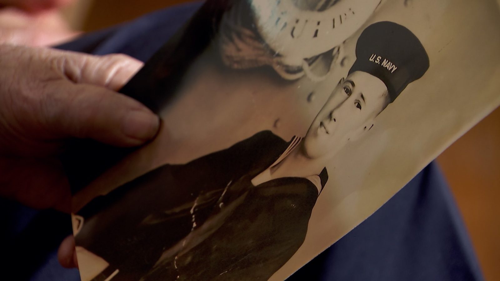 At Rick and Janet Peterson’s longtime home, Rick looks over photos from his time in the Navy. One, a picture of the ship he worked on to transport marines at Iwo Jima.