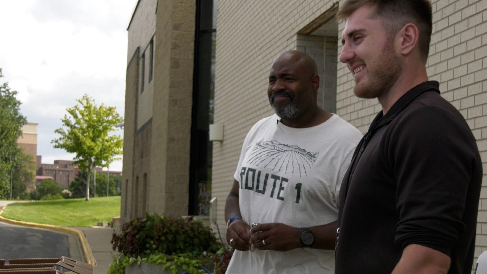 The pair isn’t just outside the Brooklyn Center Community Center for table talk. The boxes in front of them have a purpose.