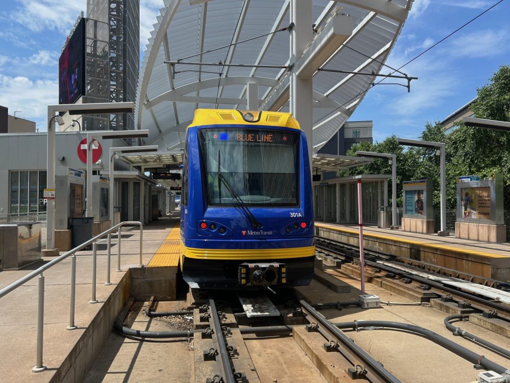 A Metro Transit Blue Line train prepares to depart in downtown Minneapolis.