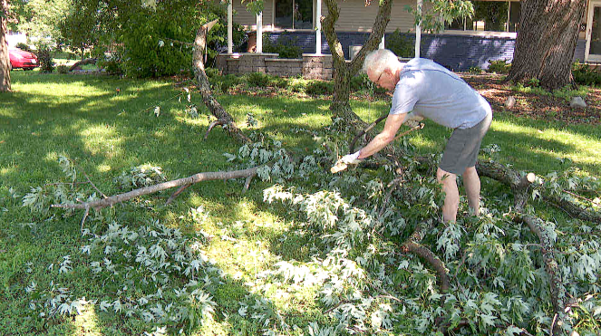 Golden Valley homeowner Jeff Springer uses a saw to cut the branch of a tree that fell in his yard.